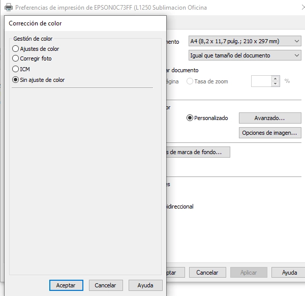 • Se abrirá una ventana de ajustes; en esta, selecciona Sin ajuste de color. Esta opción es fundamental, ya que permite que el perfil ICC controle completamente los colores, evitando que la impresora realice ajustes adicionales.