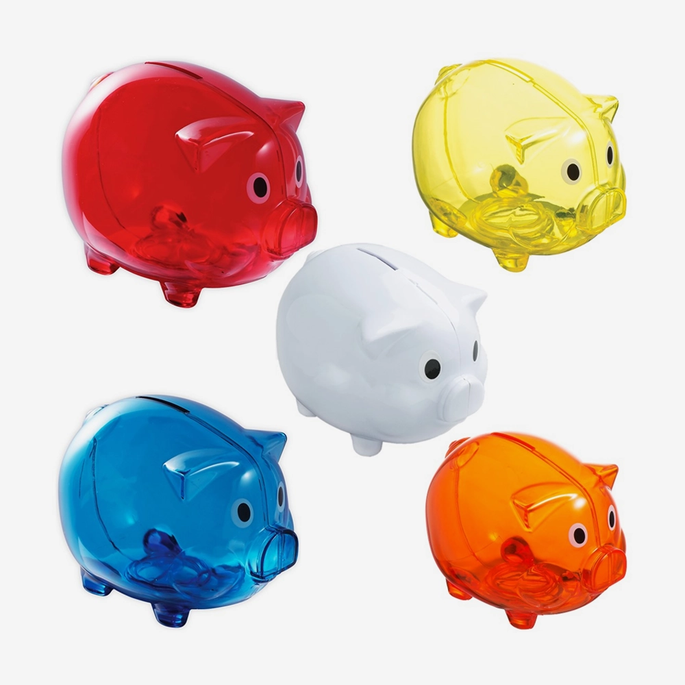- Descripción: Alcancía de plástico traslúcido, con tapa en la parte interior.