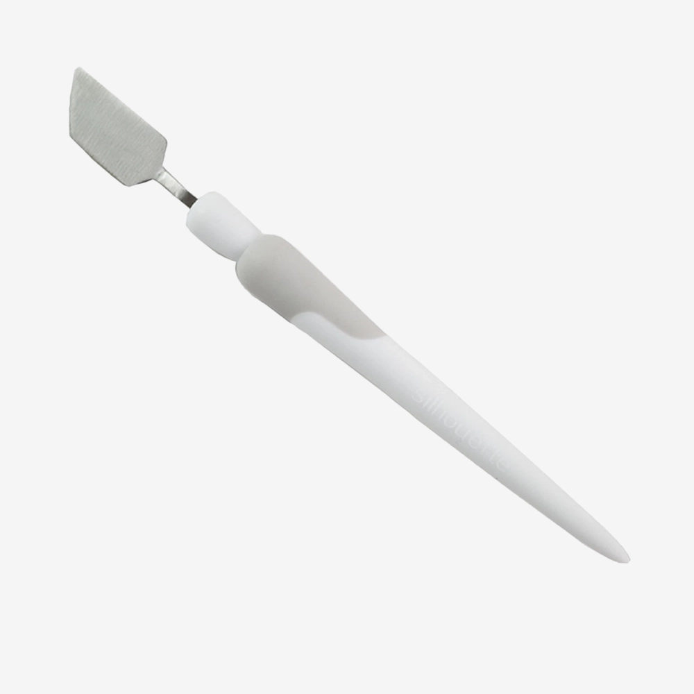 La espátula Silhouette es una herramienta esencial para trabajos que requieren precisión en el manejo de materiales adhesivos, como vinilo y papel adhesivo. Su diseño plano y ergonómico facilita levantar y manipular los materiales sin dañar el proyecto.