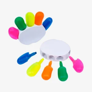 Medida: Alt: 10.5 cm Ancho: 8.5 cm Descripción: Resaltador con 5 puntas. Colores anaranjado, Verde, Amarillo, Turqueza y Rosado. Presentación: Individual, en bolsa de plástico transparente.