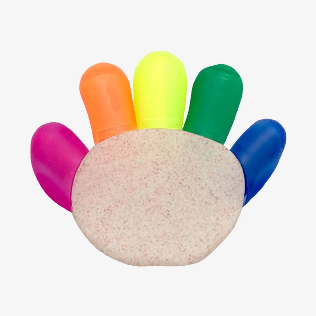 • Descripción: Resaltador en forma de Mano, con 5 puntas. Colores Anaranjado, Verde, Amarillo, Turqueza y Rosado.