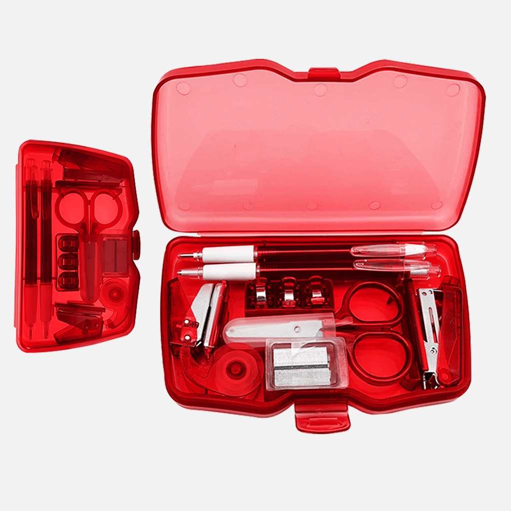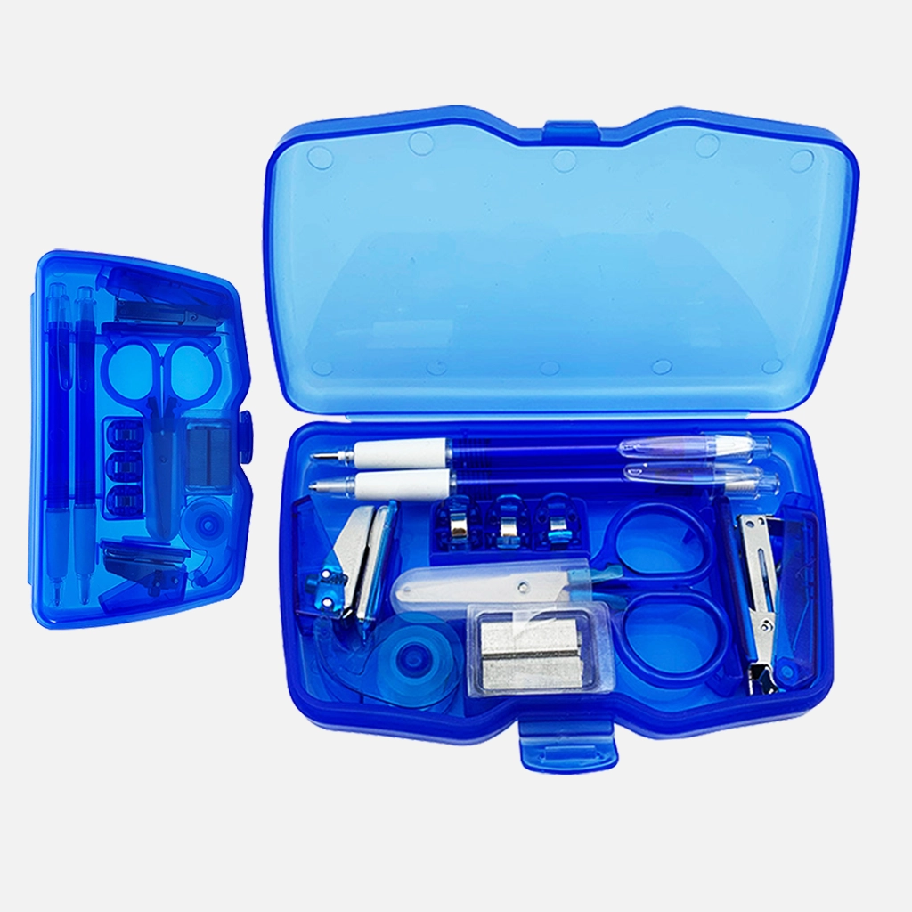 • Descripción: Estuche de plástico traslucido, contiene: 1 Tijera, 2 Lapiceros, 3 Ganchitos, 1 Cinta Adhesiva, 1 Perforadora de un hueco, 1 Engrapadora + repuestos.