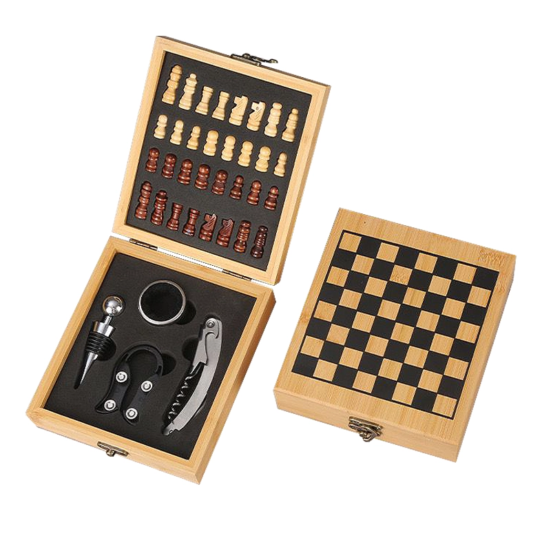 Set de Vino con Juego de Ajedrez 5 Piezas en Caja de Madera