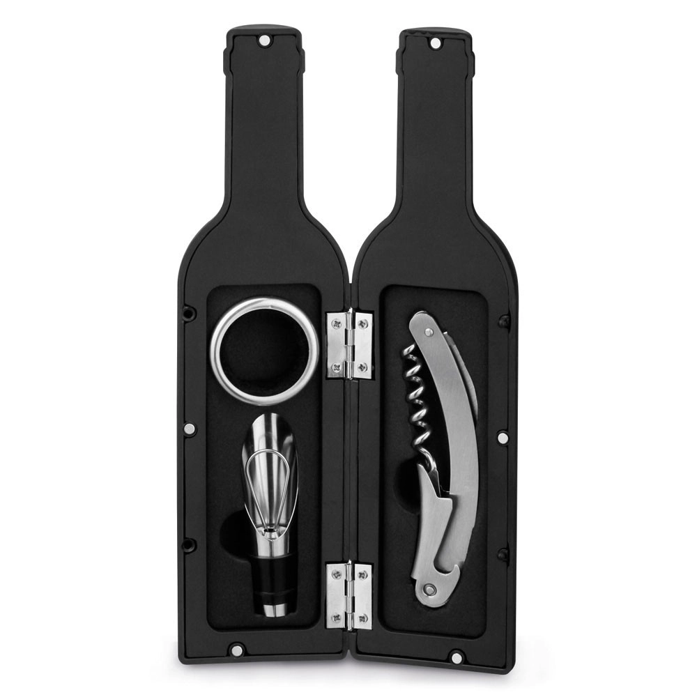 Descripción: Set de vino de 3 piezas con estuche en forma de botella. Compacto, elegante y práctico, ideal para uso o regalo.
