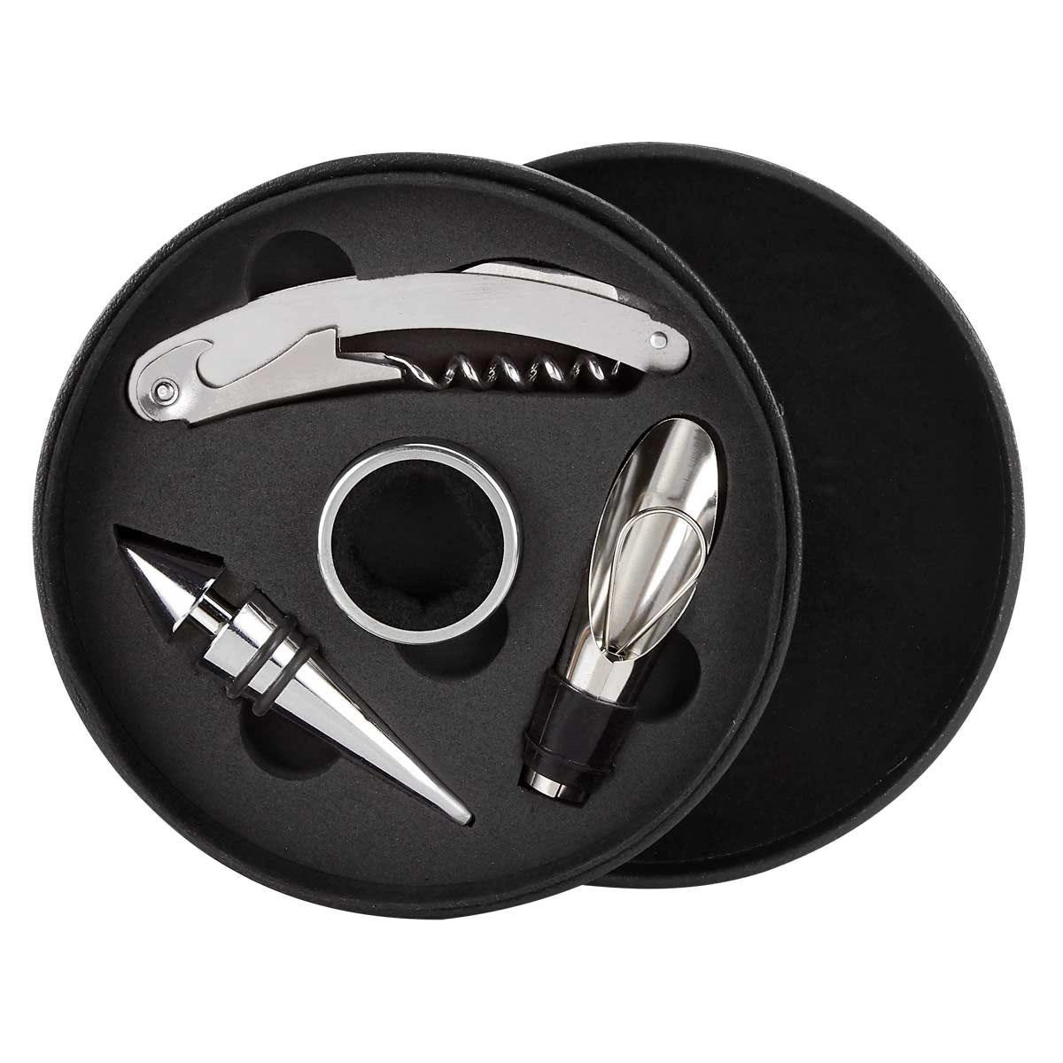 Descripción: Set de vino de 4 piezas con caja de biocuero. Elegante, práctico y funcional, ideal para disfrutar o regalar. Contiene: 01 abridor de sacacorchos, 01 tapón de vino, 01 cortador de lámina, 01 anillo antigoteo. Presentación: Caja de biocuero con cierre. Medidas: Diámetro 15 cm x Altura 4.5 cm.