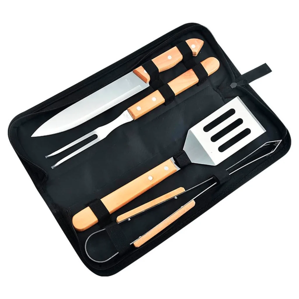 - Descripción: Set parrillero de 4 piezas en acero inoxidable, ideal para asados en casa o al aire libre. Resistente, práctico y fácil de limpiar.