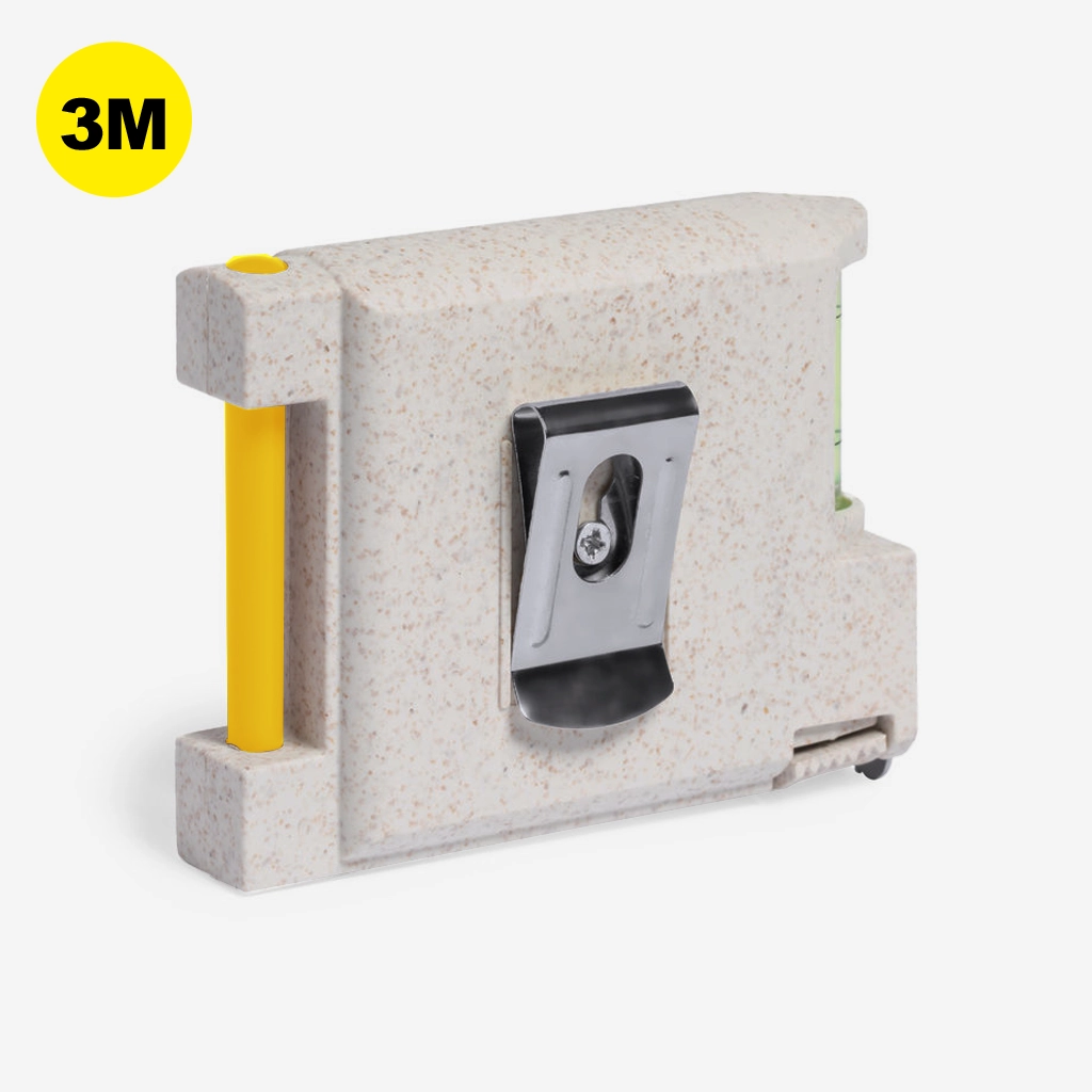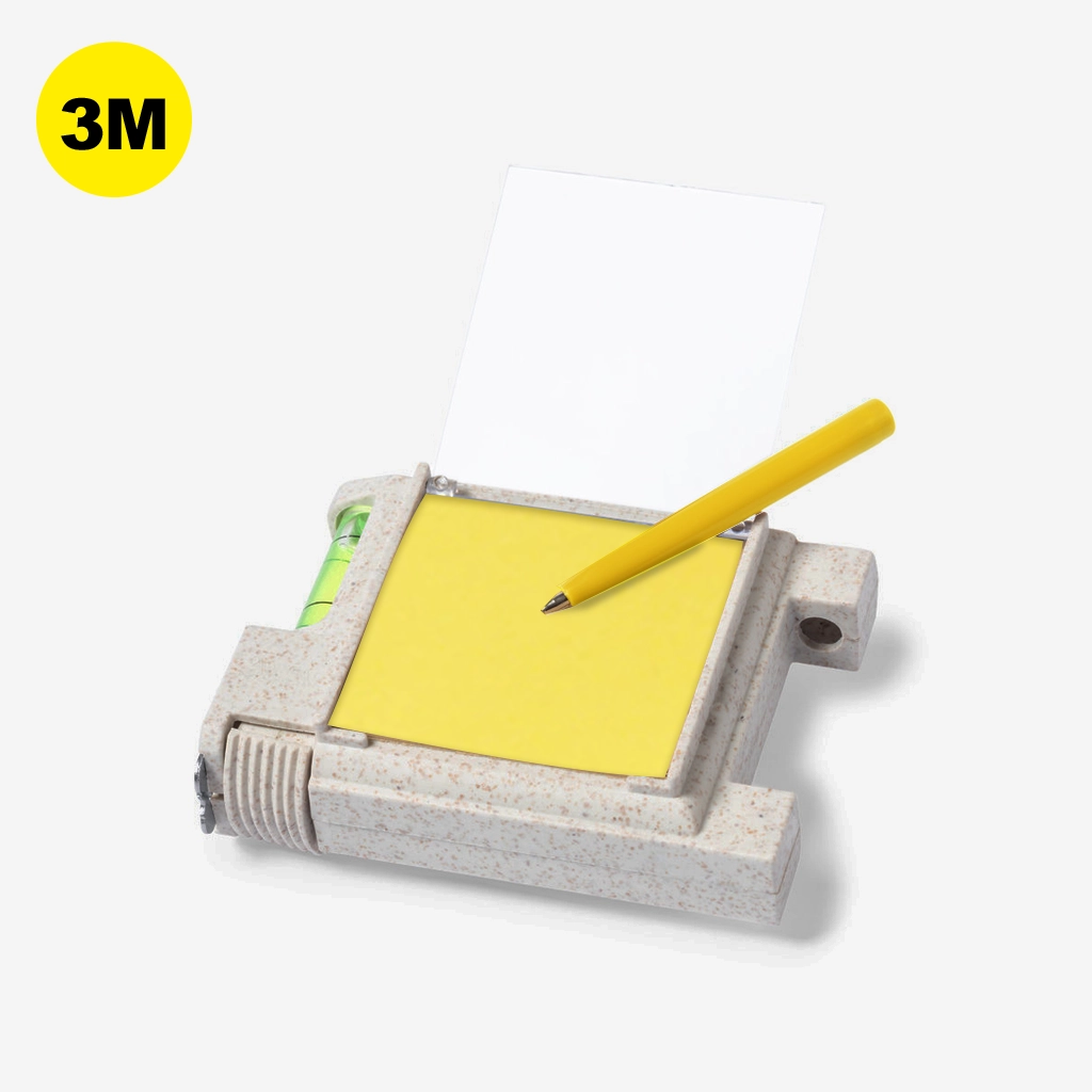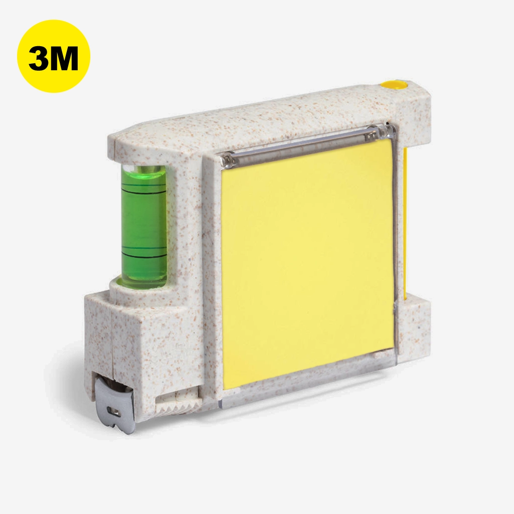 Flexómetro 3 m multifunción de línea nature, con carcasa fabrcada en caña de trigo. Con nivel integrado, soporte para bolígrafo (bolígrafo incluido) y bloc con 12 notas adhesivas en color natural. Con freno, clip metálico para cinturón y hoja con medidas en centímetros y pulgadas. Presentación en caja individual de diseño kraft.La caña de trigo fomenta la utilización de materias primas naturales, reduciendo así las emisiones contaminantes. 12 Notas Adhesivas 4,5 x 4,5 cm. Con Freno y Clip. Bolígrafo Incluido